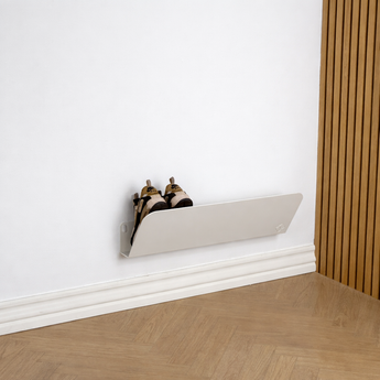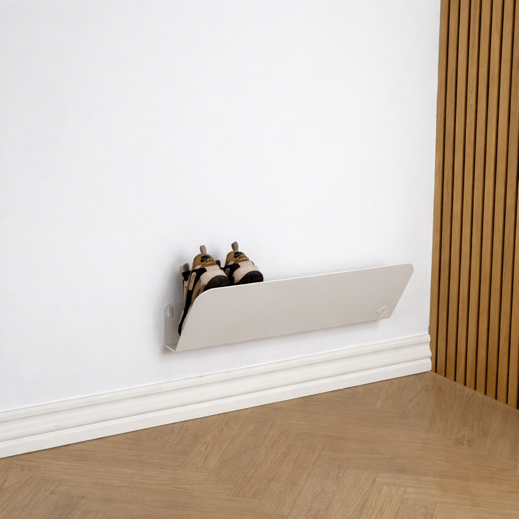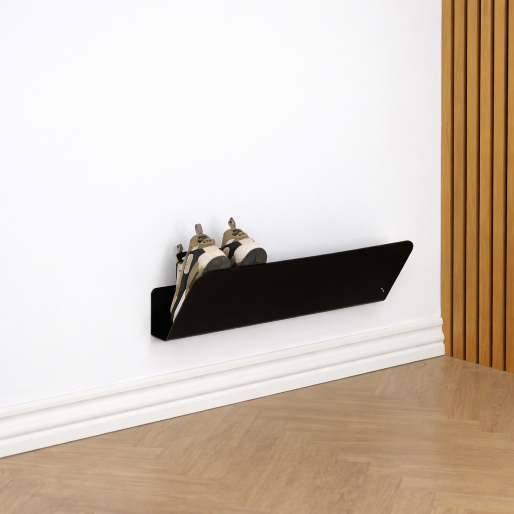 Skohylden er designet med et diskret opbuk mod væggen, som har en praktisk funktion: Skoenes snuder rammer ikke væggen, men hviler i stedet på den opbukkede flade. Det beskytter både væg og sko og giver samtidig et mere ryddeligt og svævende udtryk.